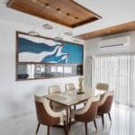 THIS PAINTING IS DESIGNED TO EVOKE A SENSE OF TRANQUILITY AND RELAXATION, OFFERING A SOOTHING EXPERIENCE FOR THE VIEWER, ESPECIALLY DURING MEALS. INSPIRED BY THE CALMING EFFECT OF WATER, THE ARTWORK FEATURES A BIRD'S-EYE VIEW OF TWO BOATS GLIDING GRACEFULLY OVER DRAMATIC WAVES, CAPTURING THE MOVEMENT AND RHYTHM OF THE WATER. WATER, OFTEN SEEN AS A SPACE FOR REFLECTION AND PEACE, HAS BEEN CHOSEN AS THE CENTRAL THEME TO PROVIDE A SERENE BACKDROP. THE BOATS, PAINTED IN VIBRANT ORANGE AND CRAFTED FROM REAL WOOD, ADD AN ELEMENT OF REALISM, DRAWING THE VIEWER'S ATTENTION TO THE HARMONIOUS PLAY BETWEEN NATURE AND CRAFTSMANSHIP. AS HUMANS ARE NATURALLY DRAWN TO WATER FOR ITS REJUVENATING QUALITIES, THIS PIECE SEEKS TO BRING THAT CALMING ENERGY INTO THE DINING OR KITCHEN AREA, OFFERING A MOMENT OF CALMNESS AND EMOTIONAL RECHARGE WITH EACH MEAL. SIZE: 144"x 36"INCH MEDIUM: ACRYLIC COLOUR YEAR-2024