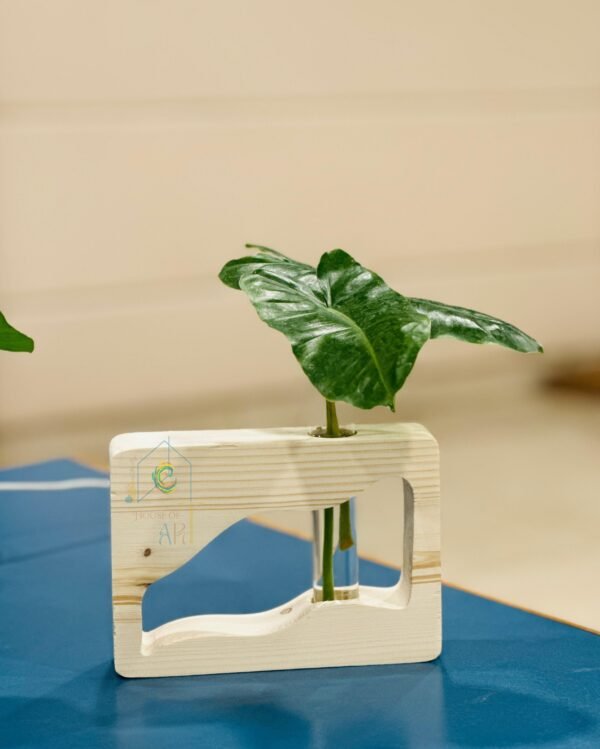 THIS DESIGN FEATURES MINIMALIST WOODEN PLANTERS WITH ORGANIC CUTOUTS, SHOWCASING TEST TUBE VASES HOLDING VIBRANT GREEN LEAVES. THE NATURAL WOOD TEXTURE AND SOFT CURVES CREATE A MODERN, ECO-FRIENDLY AESTHETIC. IDEAL FOR TABLE DÉCOR, THE COMPOSITION BLENDS NATURE AND CRAFTSMANSHIP, ADDING A CALMING, ARTISTIC TOUCH TO CONTEMPORARY INTERIORS
